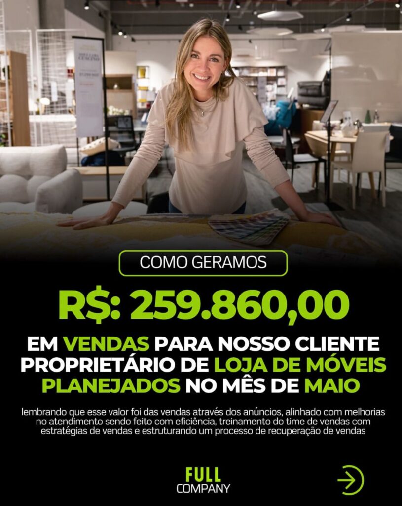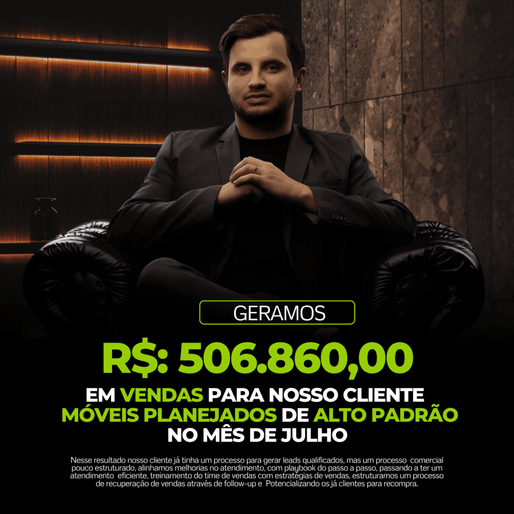 Criamos e executamos um plano estratégico personalizado para atrair todos os dias leads interessados nos seus móveis, combinando tráfego pago com processo comercial eficiente.